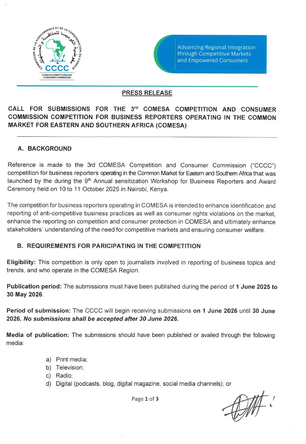 The COMESA Competition and Consumer Commission is a regional body, established under the repealed COMESA Competition Regulations, and continues to exist under the COMESA Competition and Consumer Protection Regulations of 2025 (the “Regulations”), renamed as the COMESA Competition and Consumer Commission (the “Commission”). The Regulations were promulgated pursuant to Article 55 (3) of the Treaty establishing the Common Market for Eastern and Southern Africa (COMESA). The core responsibility of the Commission is to enforce the provisions of the Regulations with the aim of promoting competition and enhancing the welfare of consumers in the Common Market. The main function of the Commission is to prohibit, monitor, and investigate anticompetitive business practices, unfair trade practices and mergers in the Common Market.
