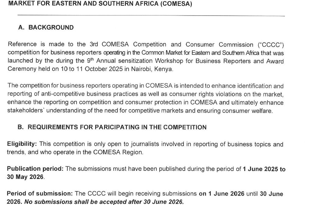 CALL FOR SUBMISSIONS FOR THE 3rd COMESA COMPETITION AND CONSUMER COMMISSION COMPETITION FOR BUSINESS REPORTERS OPERATING IN THE COMMON MARKET FOR EASTERN AND SOUTHERN AFRICA (COMESA)