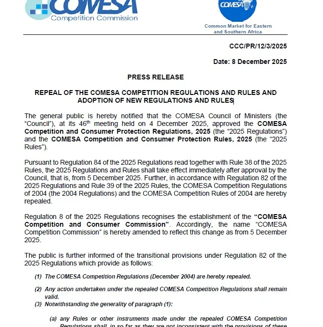 PRESS RELEASE REPEAL OF THE COMESA COMPETITION REGULATIONS AND RULES AND ADOPTION OF NEW REGULATIONS AND RULES Dec 8, 2025 Loading... Taking too long? Reload document | Open in new tab Download [215.96 KB]